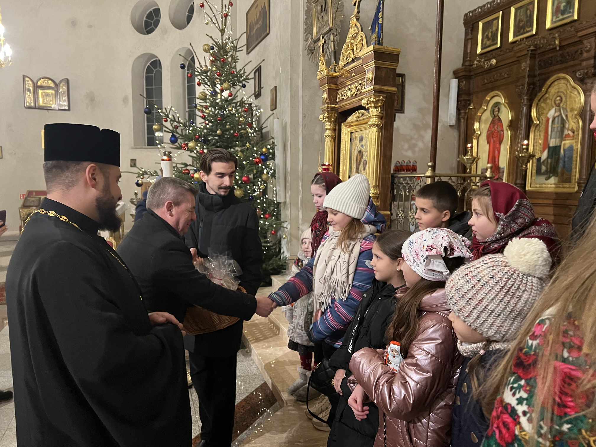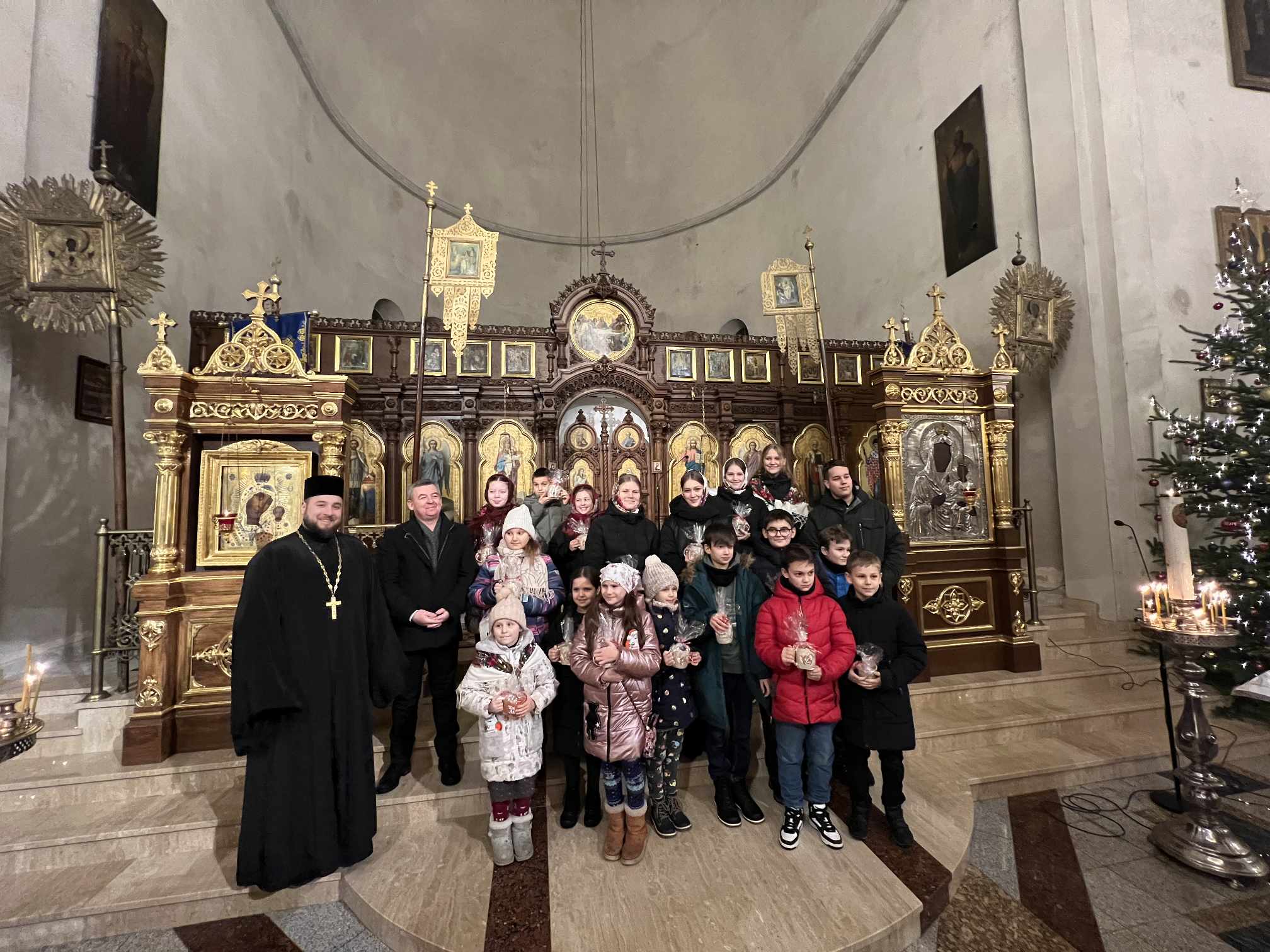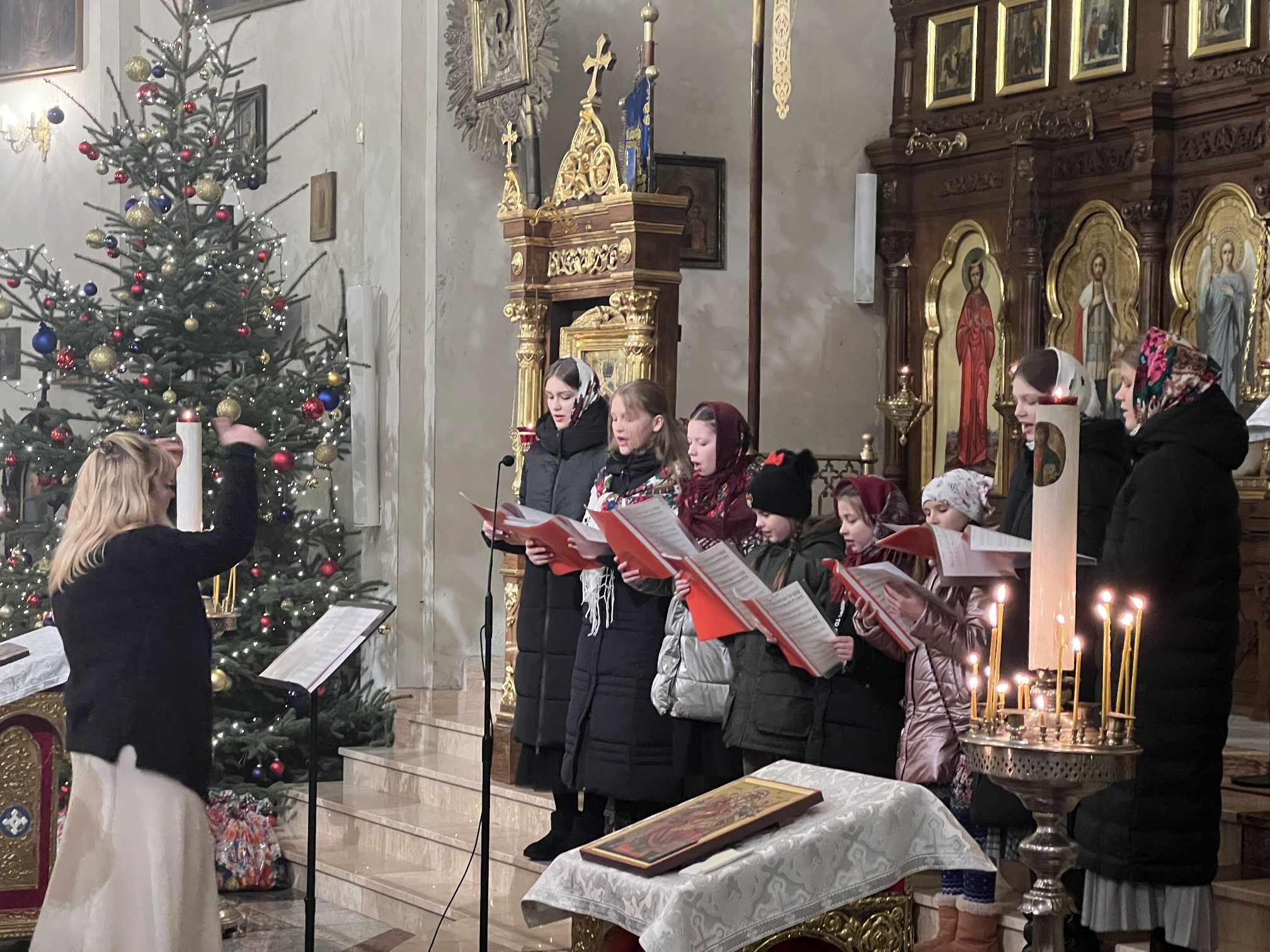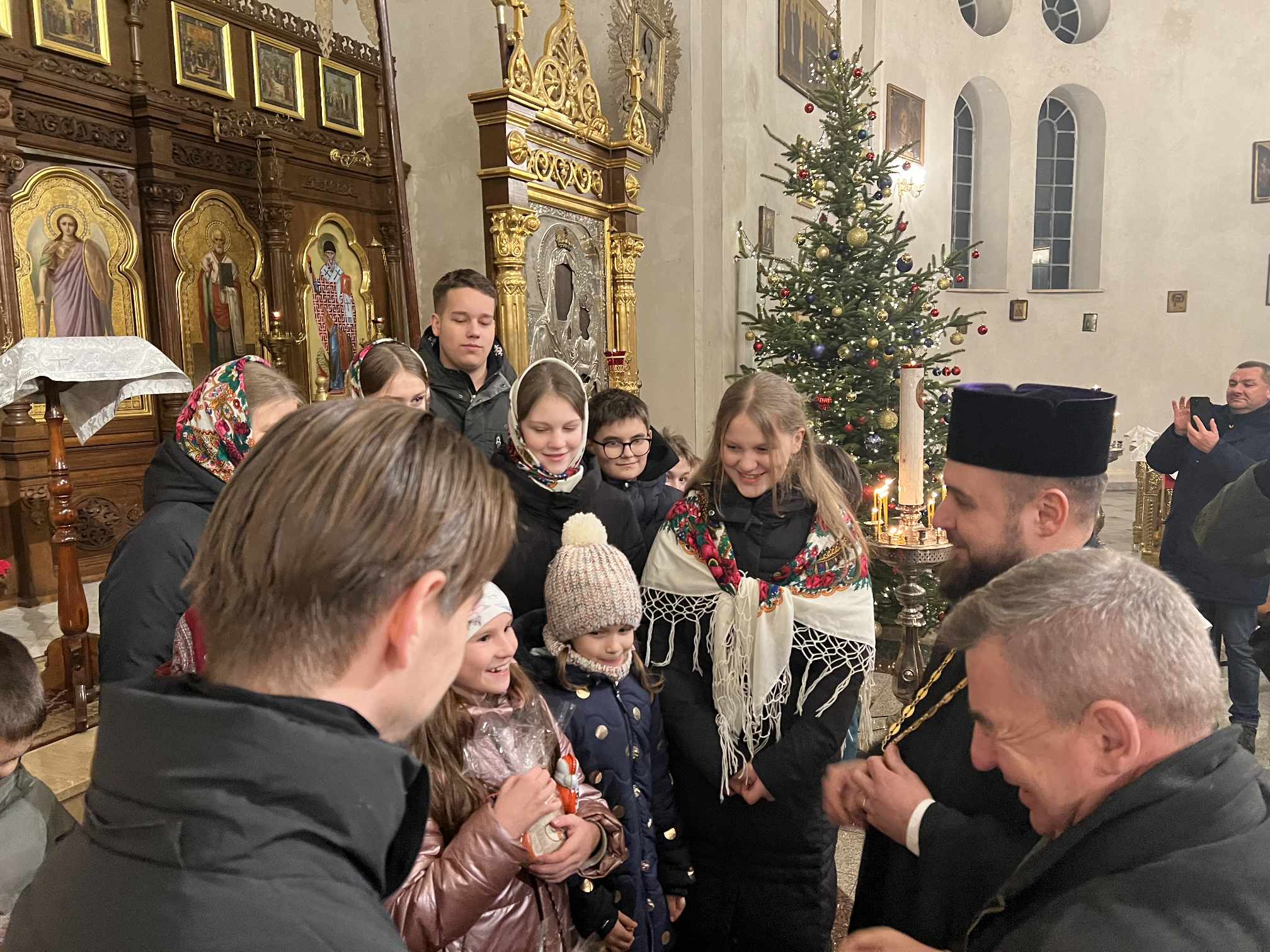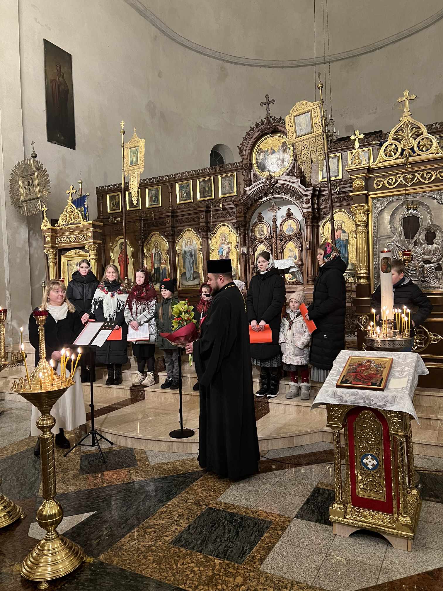 O godzinie 17.00 rodzice wraz z dziećmi zebrali się w świątyni, aby wysłuchać pięknych kolęd i wierszyków w wykonaniu chóru dziecięcego. Po przepięknym wystąpieniu najmłodszych parafian o. Marcin Bielawski, proboszcz parafii, wręczył kwiaty dyrygentce chóru p. Swietłanie i podziękował za profesjonalną opiekę nad kształceniem muzycznym dzieci, gdzie nieustannie rozwijana jest idea wychwalania Boga poprzez śpiew cerkiewny.