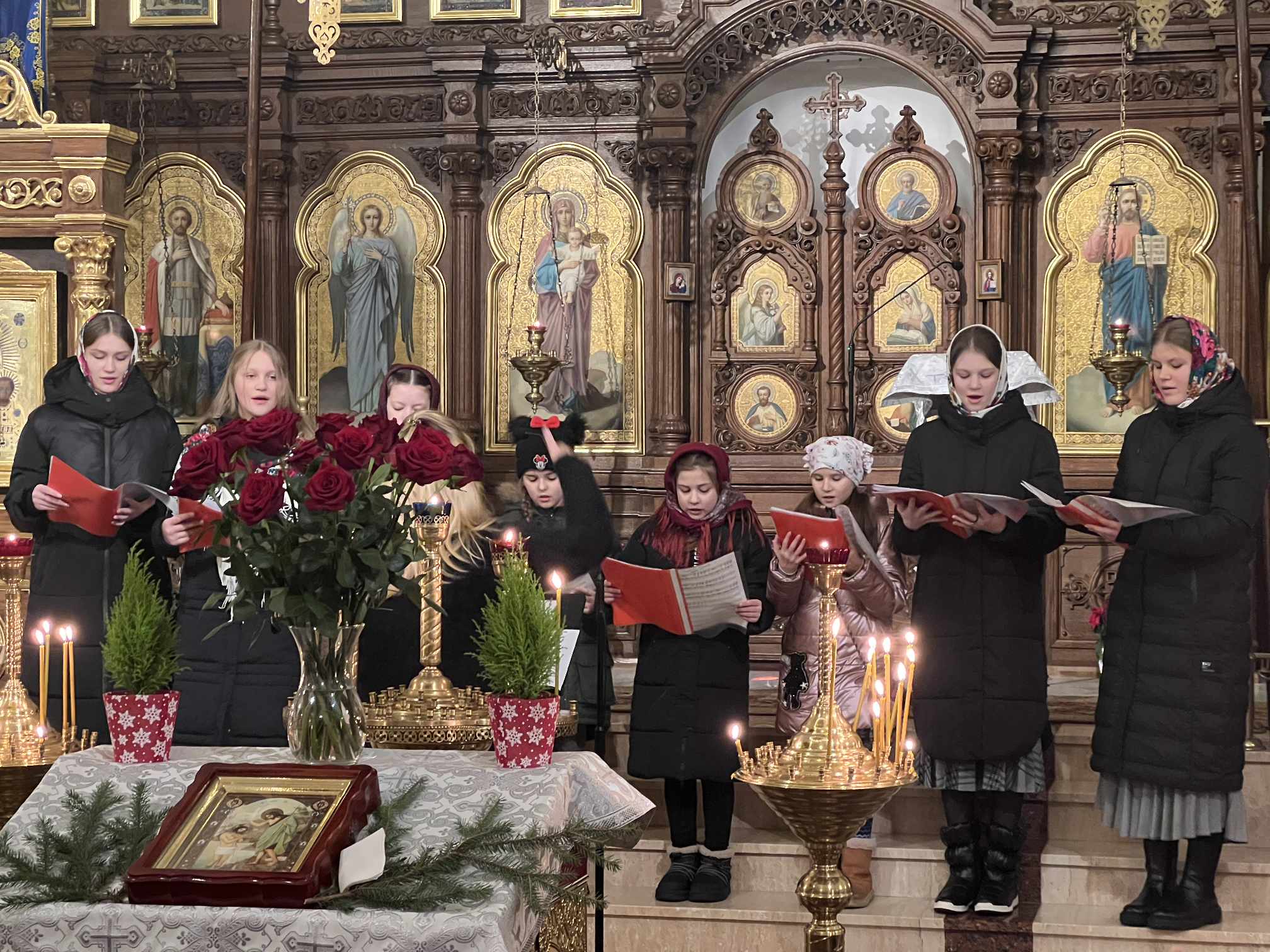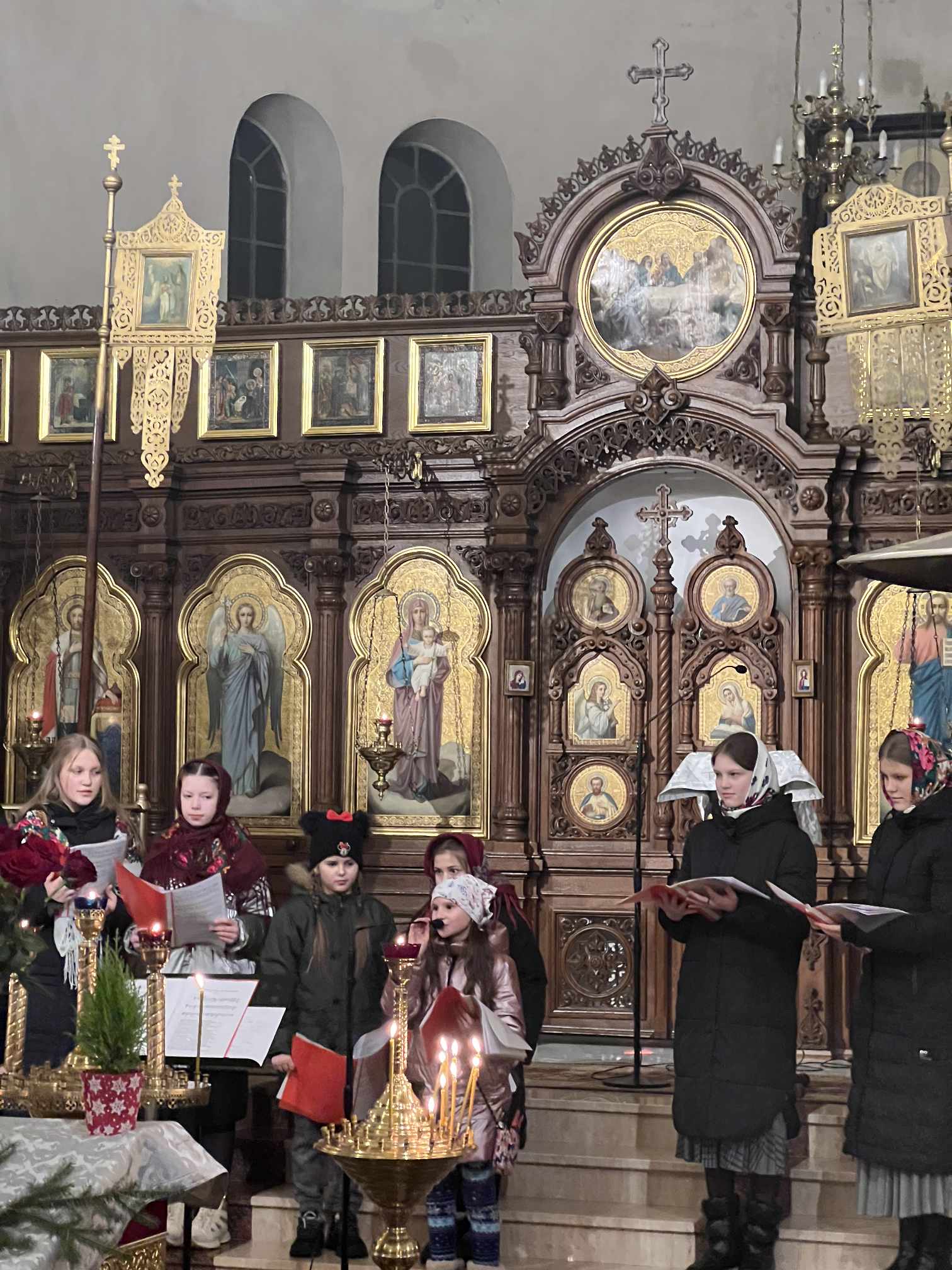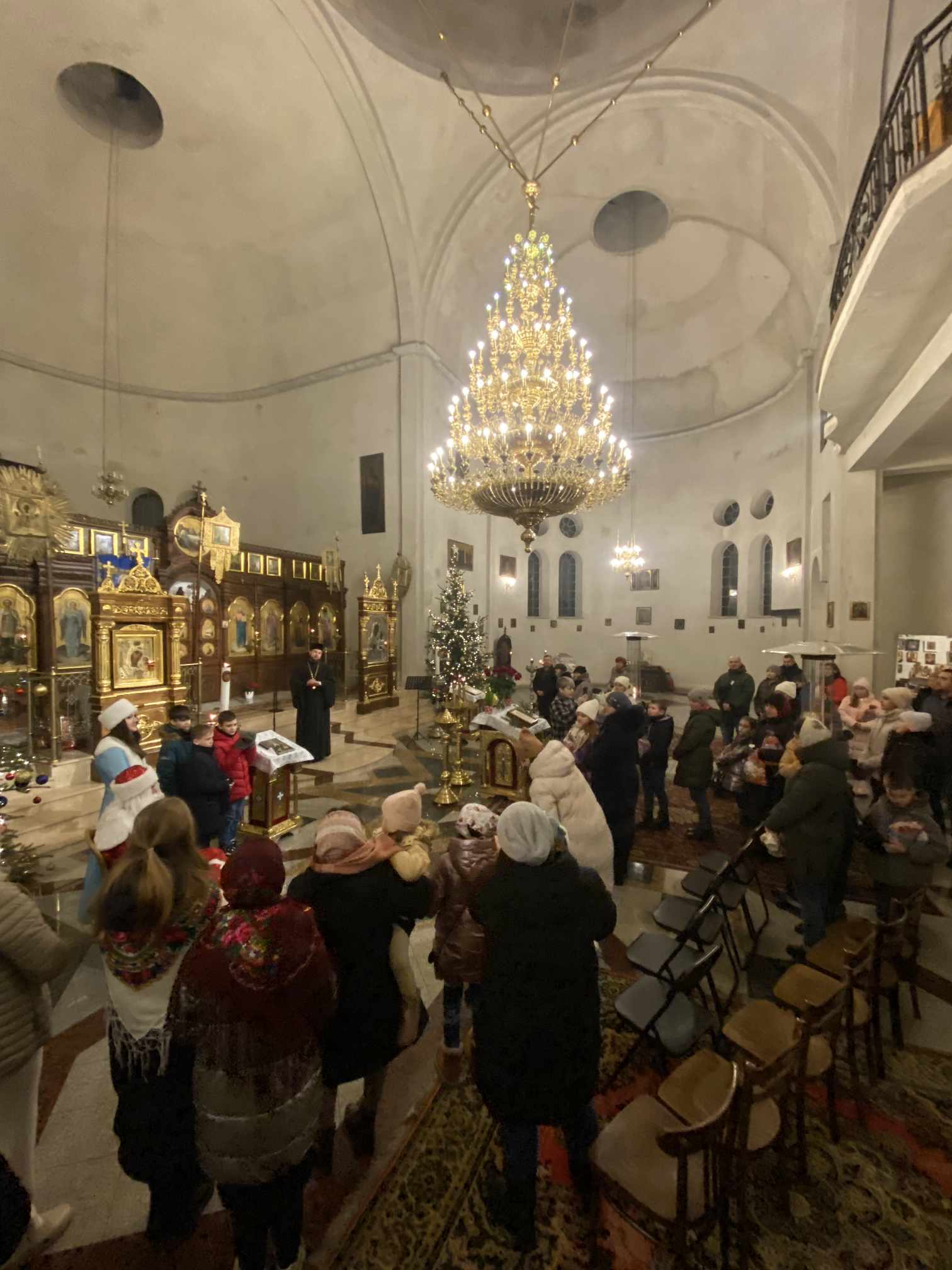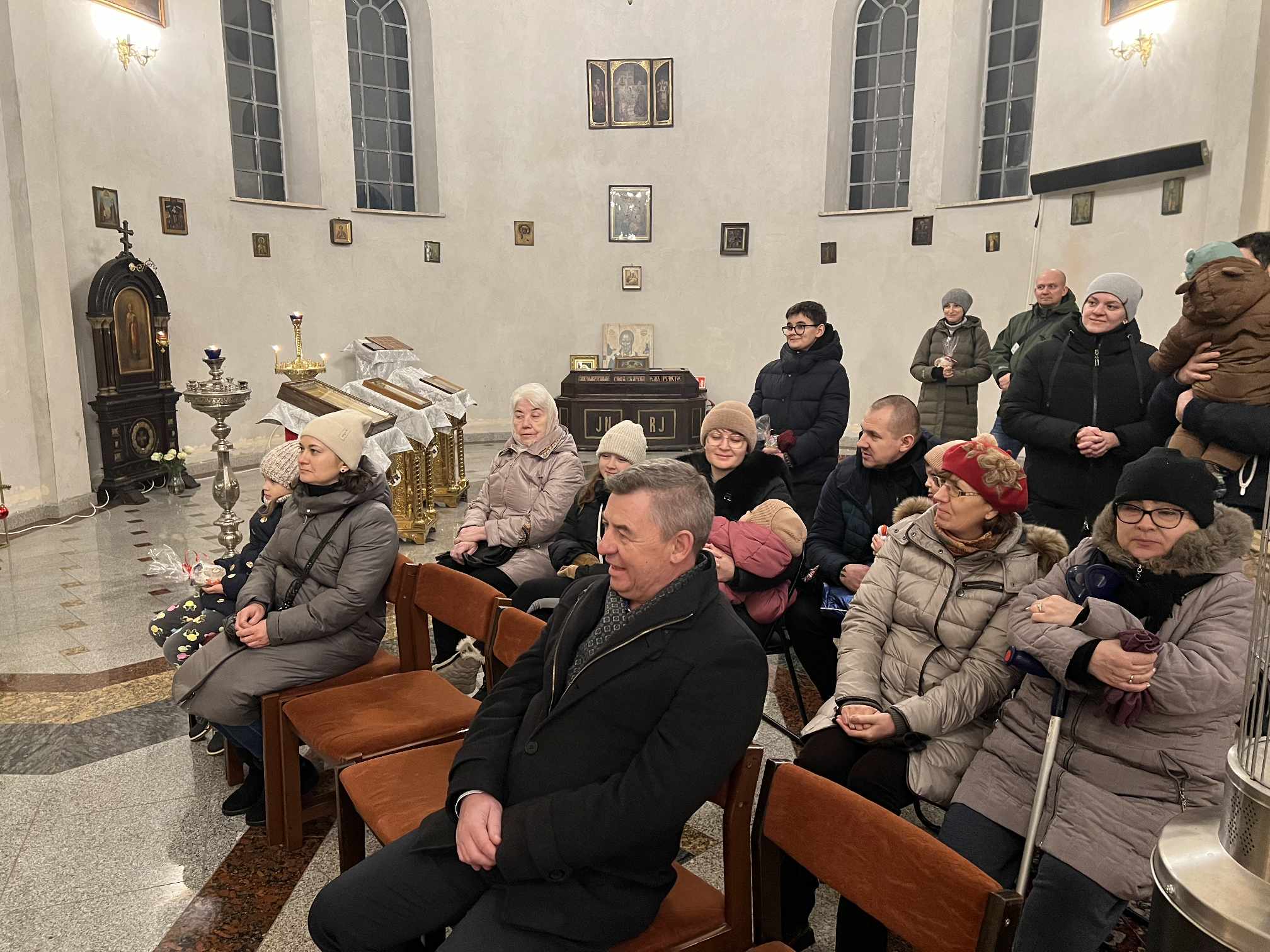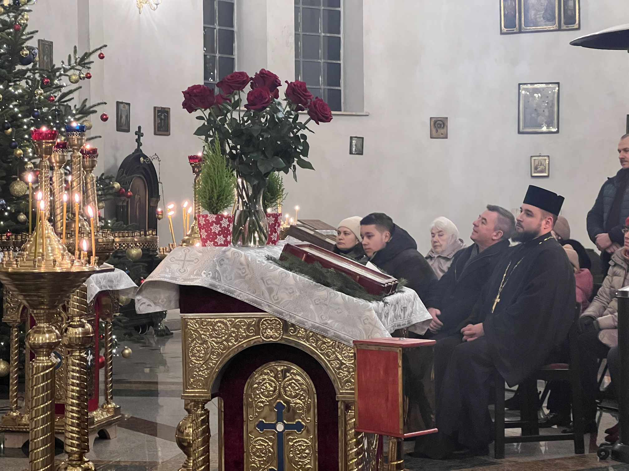 O godzinie 17.00 rodzice wraz z dziećmi zebrali się w świątyni, aby wysłuchać pięknych kolęd i wierszyków w wykonaniu chóru dziecięcego. Po przepięknym wystąpieniu najmłodszych parafian o. Marcin Bielawski, proboszcz parafii, wręczył kwiaty dyrygentce chóru p. Swietłanie i podziękował za profesjonalną opiekę nad kształceniem muzycznym dzieci, gdzie nieustannie rozwijana jest idea wychwalania Boga poprzez śpiew cerkiewny.