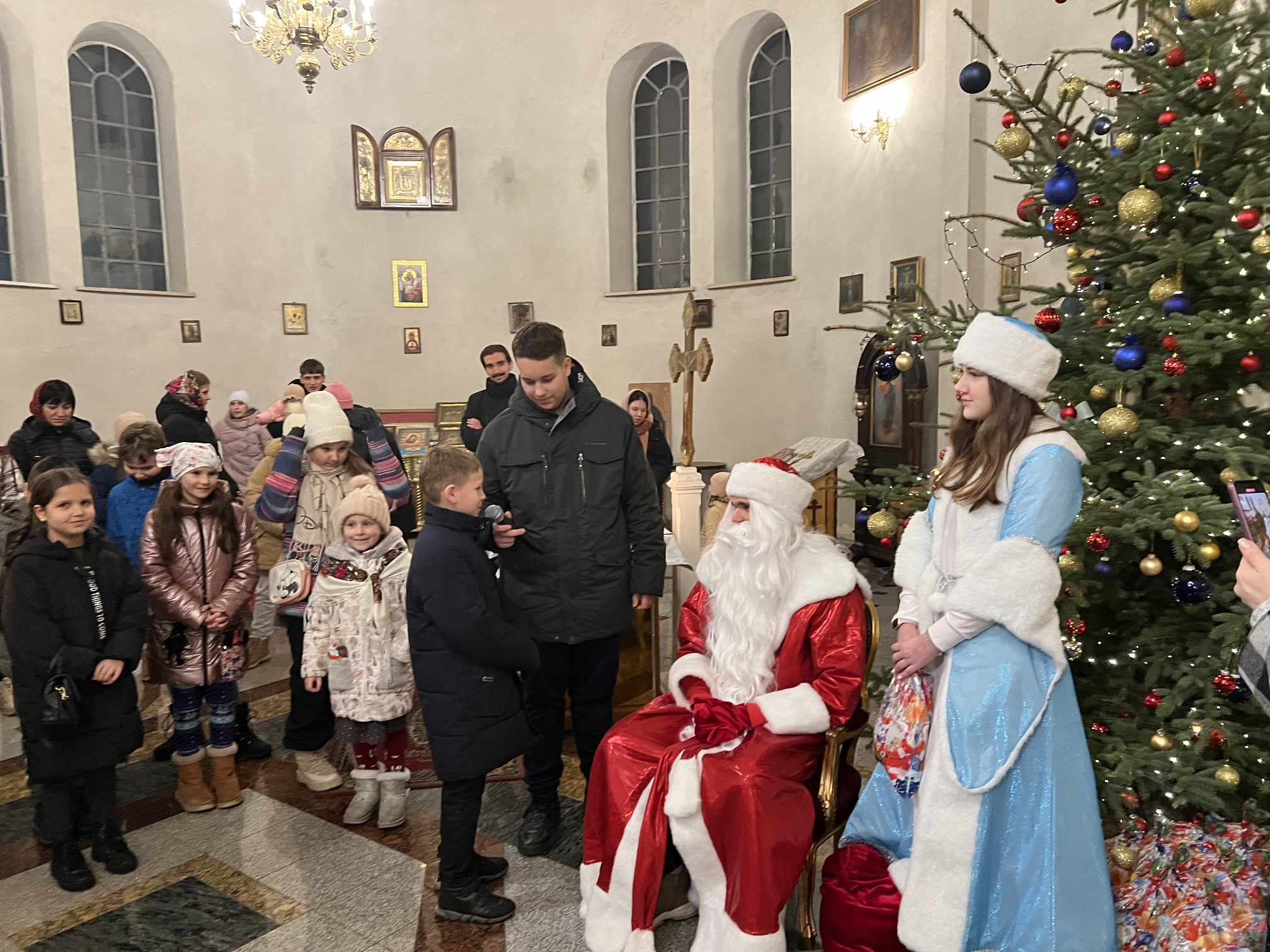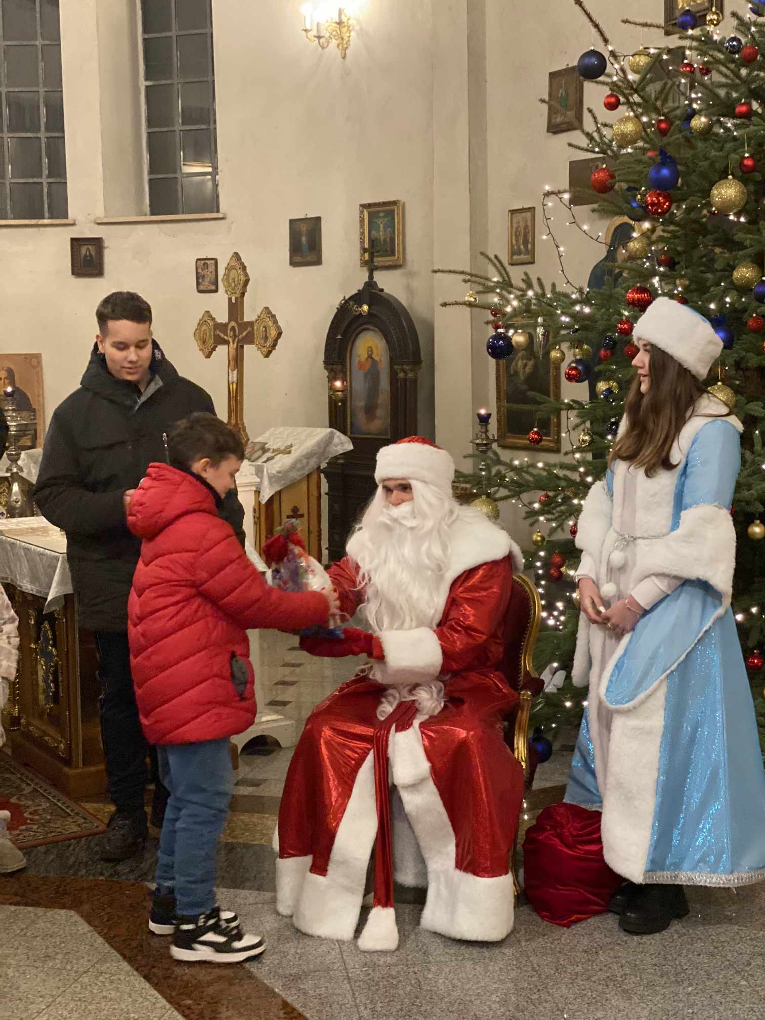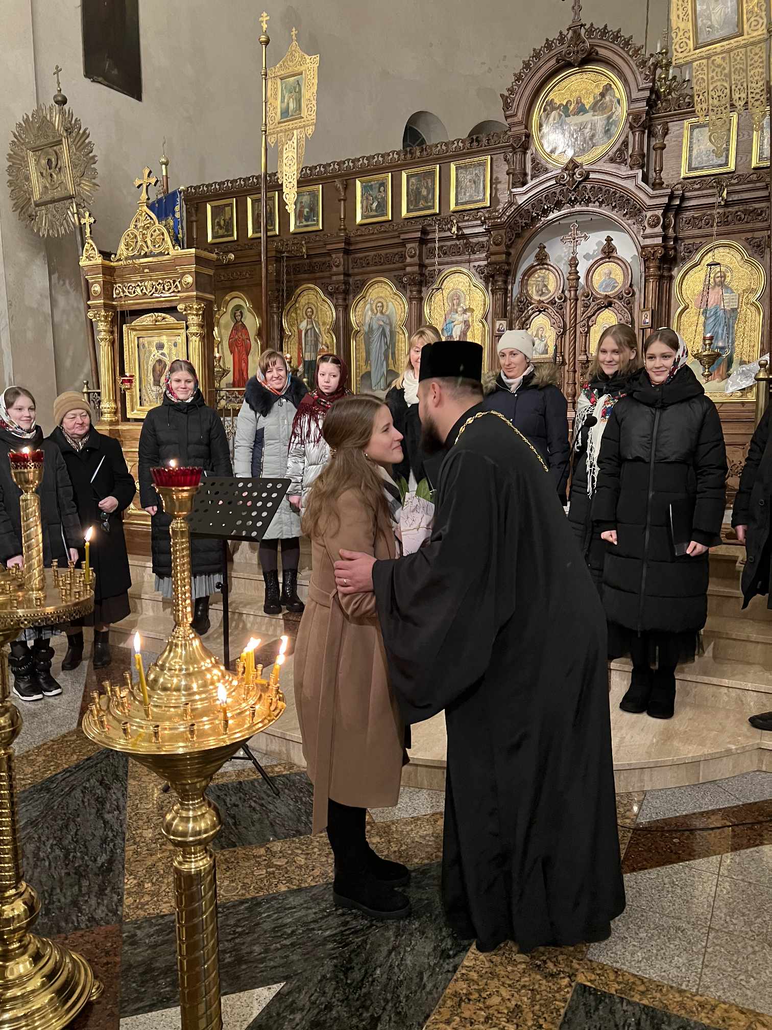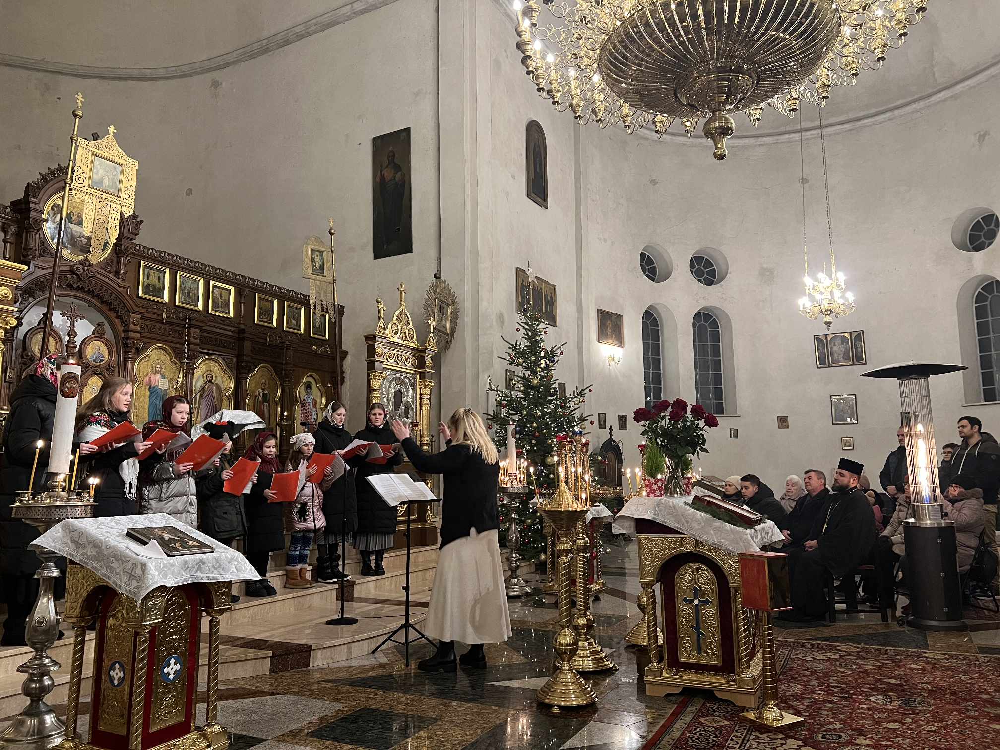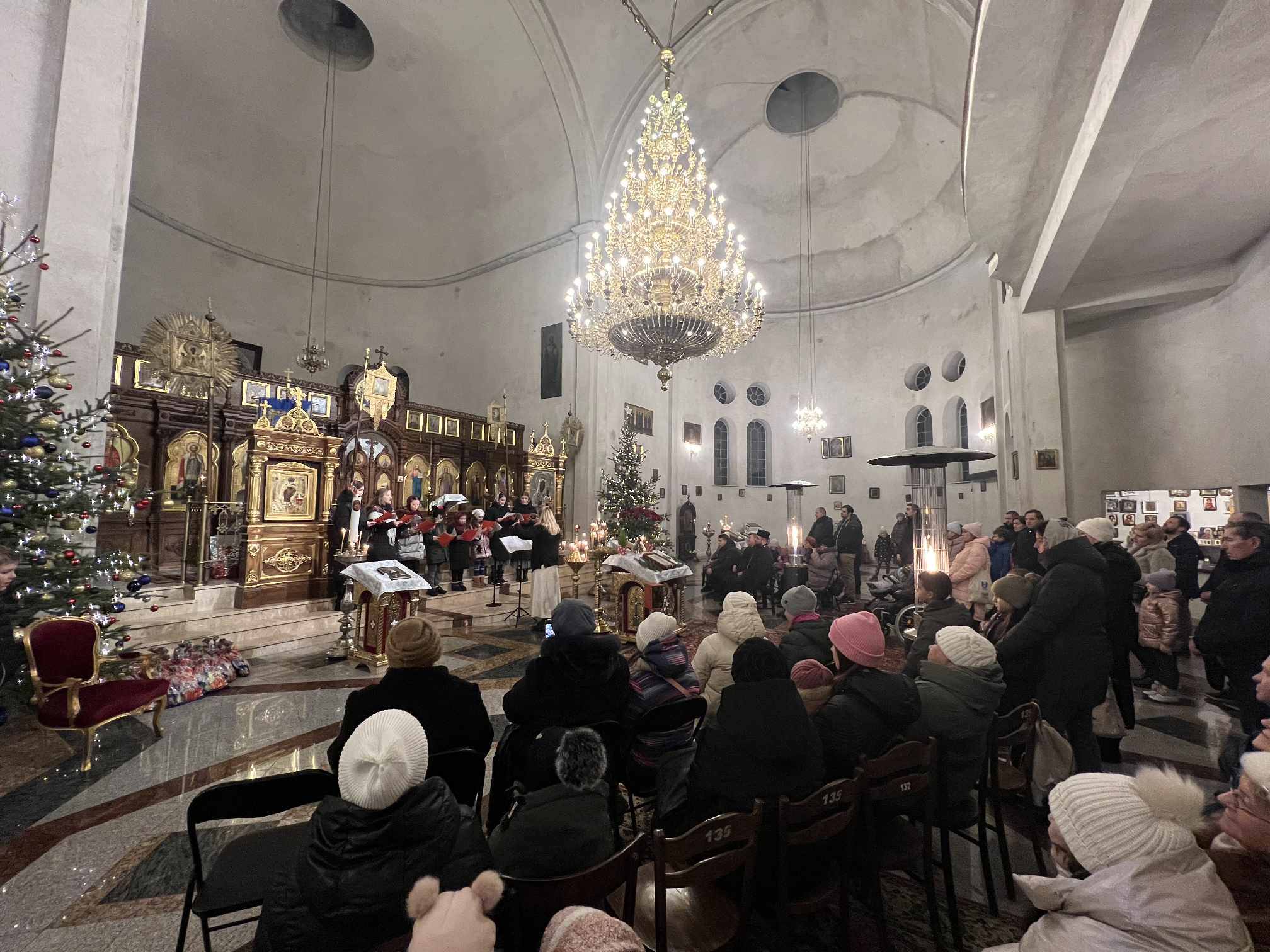 O godzinie 17.00 rodzice wraz z dziećmi zebrali się w świątyni, aby wysłuchać pięknych kolęd i wierszyków w wykonaniu chóru dziecięcego. Po przepięknym wystąpieniu najmłodszych parafian o. Marcin Bielawski, proboszcz parafii, wręczył kwiaty dyrygentce chóru p. Swietłanie i podziękował za profesjonalną opiekę nad kształceniem muzycznym dzieci, gdzie nieustannie rozwijana jest idea wychwalania Boga poprzez śpiew cerkiewny.